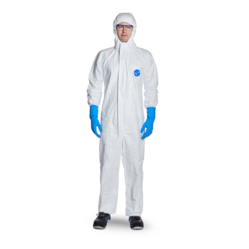 Coverall with 3-piece hood. Ergonomic-protective design. Stitched external seams. Elasticated wrists, ankles and face. Elasticated waist (glued-in). Tyvek® zipper and flap. White. Antistatic.